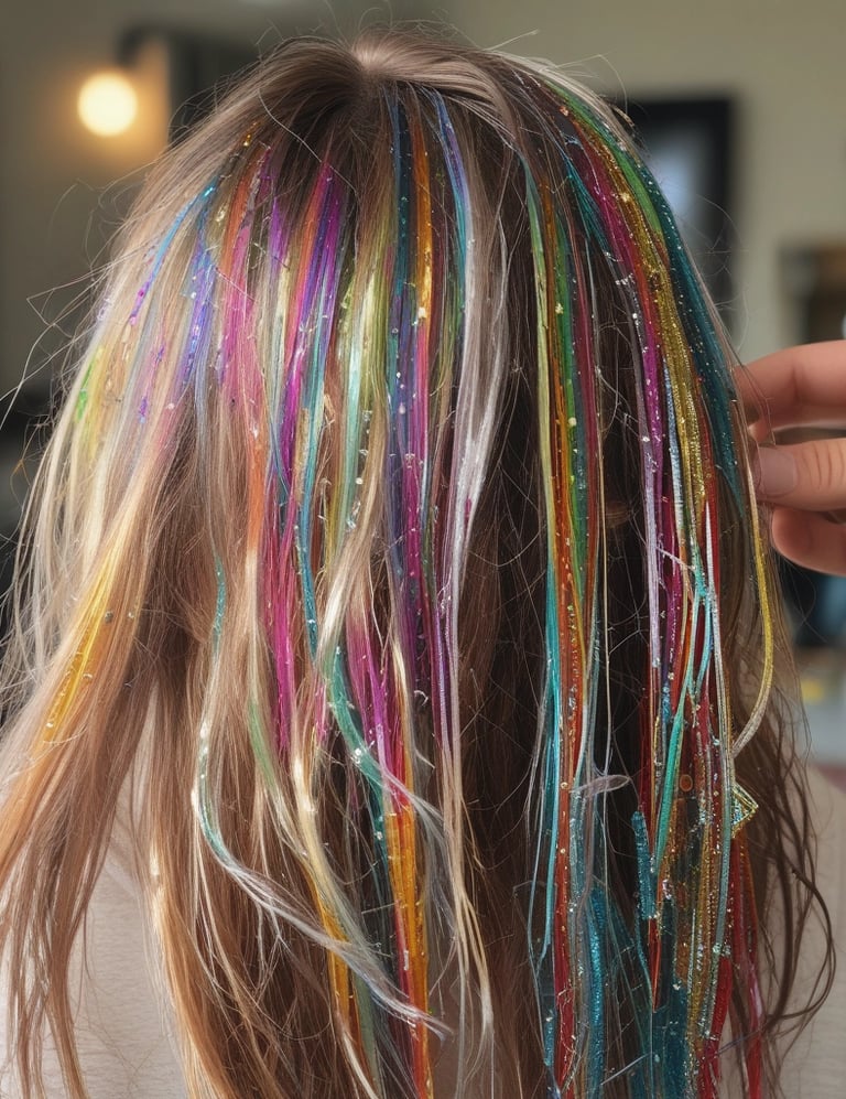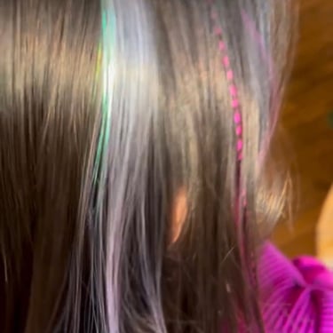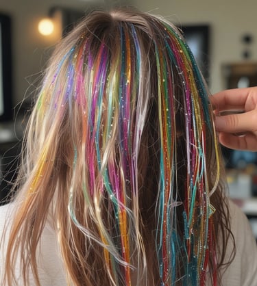 At The Tinsel Fairy, we believe that everyone deserves a little sparkle in their life. Specializing in the art of hair tinsel application, colored hair extensions, feathers and more, we’re here to transform your hair into a dazzling masterpiece.